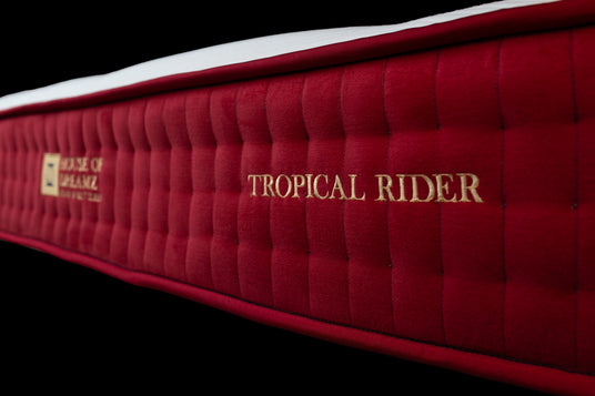 El Tropical Rider te transporta a costas serenas, con un estampado inspirado en las olas y bordes en rojo burdeos. Su material principal son las FIBRAS DE COCO sostenibles para un soporte flotante, combinadas con otros materiales naturales, como el LÁTEX y el ALGODÓN ORGÁNICO/LANA GOTS NLD, que garantizan una experiencia de descanso fresca y transpirable, pero también lujosa, saludable y duradera, como una escapada al paraíso.